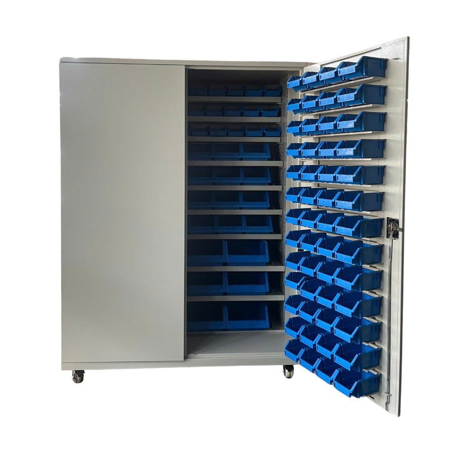 Hai cánh tủ tích hợp 16 tầng đặt khay nhựa A5 (mỗi tầng 5 khay), giúp phân loại chi tiết nhỏ ngăn nắp, dễ tìm.