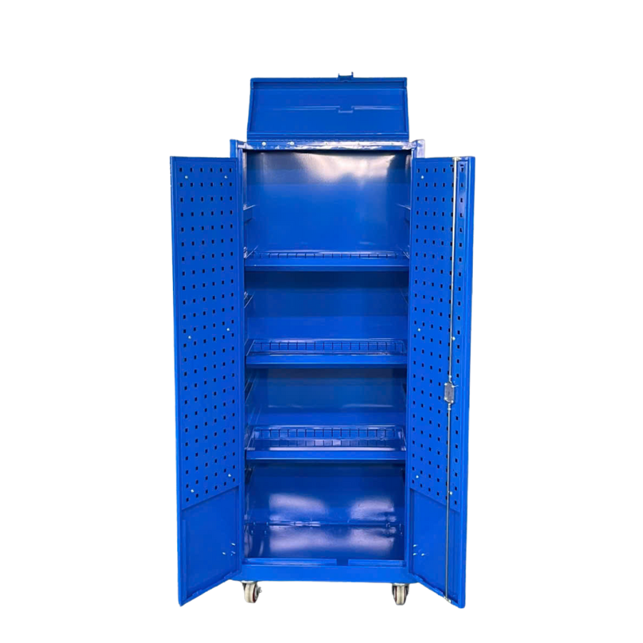 Hai cánh tủ có đột lỗ treo dụng cụ, kèm 2 hộp đựng nhỏ, giúp tối ưu không gian sử dụng.